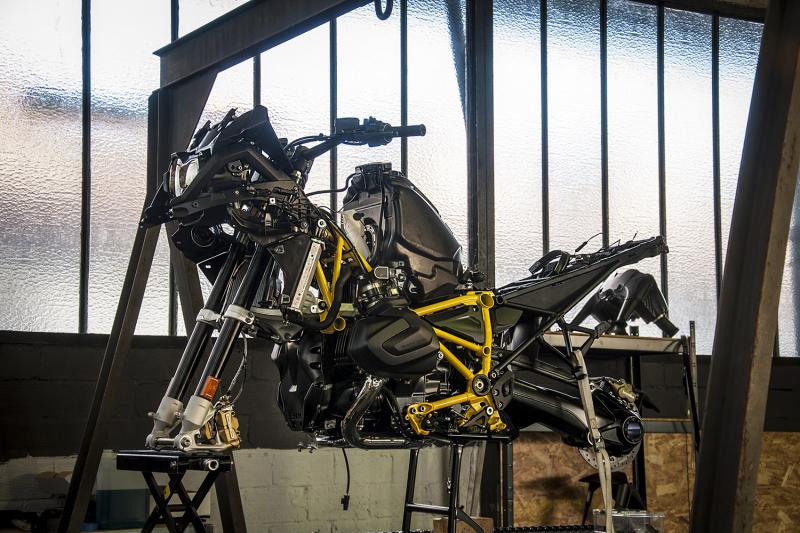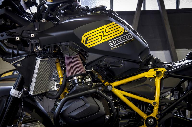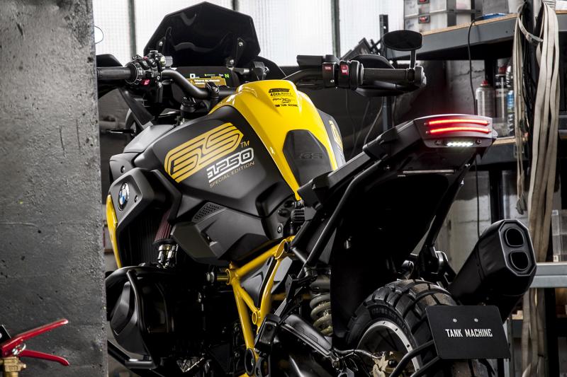 Entièrement démontée, le cadre principal de la BMW R 1250 GS a été peint en jaune, en respectant les coloris de la série qui a célèbré cette année ses 40 ans. Cette couleur se retrouve également sur les carénages, le réservoir et la selle mais également sur les feux additionnels, ajourés de chaque côté de la moto. Sur l’arrière, un support de plaque déporté a été ajouté ainsi qu'un nouveau feu arrière avec une barre de Led Tank Machine et une sortie d’échappement à valve coloris noir sablé, signée Jekyll & Hide. Au niveau du poste de pilotage, une inscription Tank Machine apparait sur les pare-mains, les rétroviseurs en embouts de guidon, ainsi que la bulle noir et jaune. Les flancs de réservoir arborent de chaque côté une signature GS 1250 spéciale, pour rendre cette édition exclusive encore plus exceptionnelle.