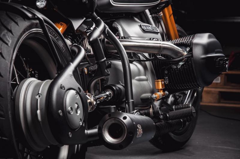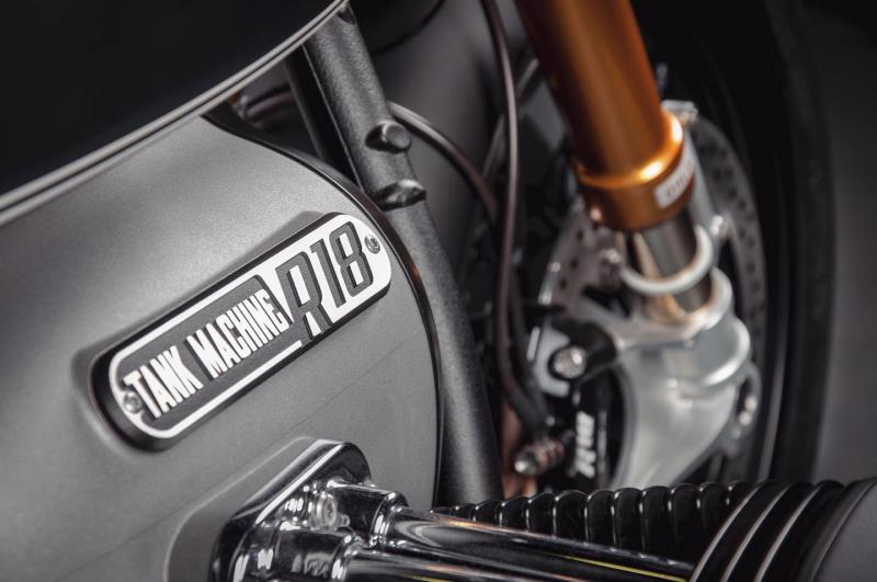 peinture Complète Flat Grey, traitement partie cycle et moteur « Satin Black », échappements Jekill&Hide à valves Black courts, sellerie cuir « Double Black » capiton, pneumatiques Metzeler ME88 extra large (200), guidon BeachBar, rétroviseurs end, kit clignotants avant chrome, feu arrière Led multifonctions, support immatriculation latéral, sliders moteur, emblèmes BMW Alu (x3), plaque ID Tank / R 18.