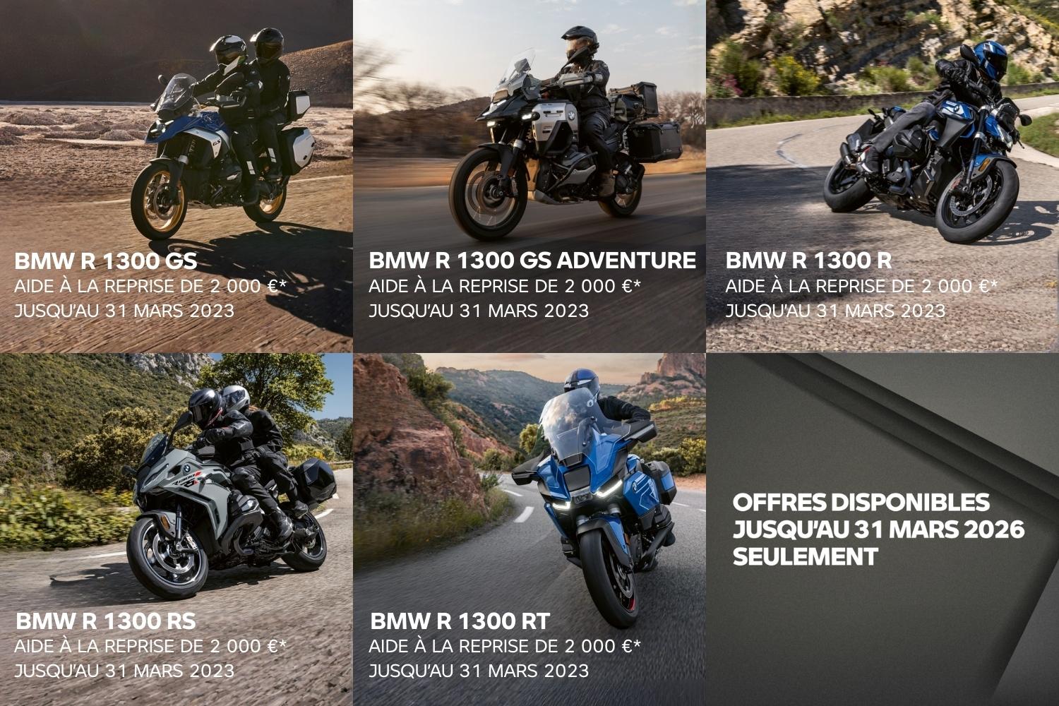 Pour faciliter votre passage à une moto BMW plus neuve ou plus performante, une aide à la reprise de 2 000 € est proposée sur toute la série des modèles BMW R 1300, comprenant les BMW R 1300 GS, GSA, R , RSet RT.